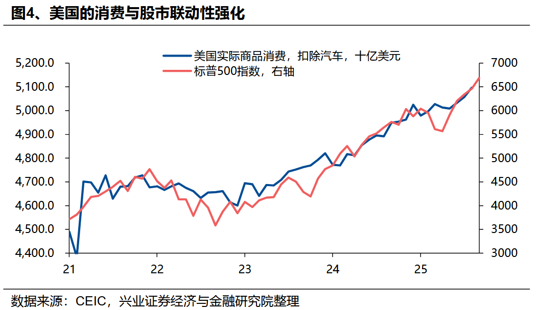 AI浪潮對當前美國經濟增長貢獻也頗爲明顯。由於人工智能並非美國國民經濟分類中的單一行業,難以直接衡量,我們從兩個維度進行匡算:一是狹義口徑,四大科技巨頭(谷歌、Meta、英偉達、微軟)資本開支對2025年二季度美國實際GDP同比增速的拉動達到0.5個百分點,對當期美國實際GDP同比增速的貢獻達到24%;二是相對廣義一點的口徑,信息處理設備及軟件投資及數據中心建築投資對2025年二季度美國實際GDP同比增速的拉動達到0.9個百分點,貢獻達到42%。若剔除AI相關的資本開支,美國經濟增速放緩態勢更爲明顯。美國經濟依賴高收入人羣,導致整體經濟指標掩蓋了結構分化的事實高收入羣體通過薪酬、股權兩個層面更受益於AI浪潮的發展。一方面,如前所述,AI產業的特徵意味着高收入羣體無論從就業還是薪酬層面可能都是更爲受益的;另一方面,美國收入階層過去持續積累的“撕裂”問題,使得高收入羣體的資產中股票佔比明顯高於低收入羣體。根據美聯儲的數據,截至2025年二季度末,收入前1%的羣體總家庭資產當中股票基金佔比爲47.7%,收入前20%的羣體該比例爲34.4%,遠高於整體家庭資產當中股票基金比例27.4%。更重要的是,美國經濟近年來愈發依賴高收入人羣,使得整體經濟指標體現出一定的“韌性”。根據穆迪估算[4],美國收入最高的10%家庭(定義爲年收入約25萬美元及以上)的消費支出佔全國總比重近三十年來從36%大幅上升至49.7%,創歷史新高,美國國內生產總值(GDP)的增長嚴重依賴高收入羣體的消費習慣,收入前10%羣體的支出至少貢獻了三分之一的GDP。換言之,考慮到美國以消費爲主導的經濟體特徵,美國經濟正愈發地依賴高收入人羣。近期鮑威爾也曾指出美國經濟日益依賴高收入人羣的事實[2]。另一個表徵此現象的指標是,美國的實際商品消費(剔除近年受供給端波動影響較大的汽車)與高收入人羣財富效應直接相關的股票市場表現的相關性正進一步增強。但AI產業“重資本輕人力”的特徵,導致其對就業和底層消費作用有限