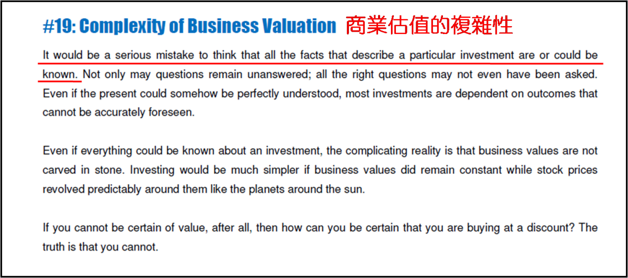 金吾財訊 | 對於有“小巴菲特”之稱的賽思·卡拉曼 (Seth Klarman) 於《安全邊際》提出的30個重要思想,今日是有關“估值”的探討,第十九個思想是“商業估值的複雜性”。卡拉曼表示若有人覺得能看透任何一個投資項目背後的所有特性和邏輯,他就犯下一個嚴重錯誤。究其原因,關於該投資項目的問題總會有不能找到答案的,並且該問的問題也經常沒人問。就算現在能夠完美地瞭解某投資項目,絕大部分投資的未來結果,都不能被準確預測。即或假若一項投資中的所有細節都被知道了;但一間公司的實際價值卻不會是刻在石頭上人盡皆知的,這纔是現實的最複雜之處。