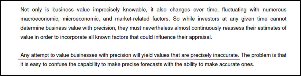 其作用更大程度是爲合乎社會規範,而非爲了反映公司的經濟價值。因此,這樣的合理會計估算絕對談不上是精確估值;畢竟金額不大的幾千美元房子也難以準確估價,更何況是對所處商業環境龐大又複雜的公司進行估值呢?我們根本無法爲公司正確估值,而且公司的實際價值也總是在變,它會隨着無數的宏觀經濟、微觀經濟,以及市場相關的因素不停波動。在任意一個靜止的時間節點,投資者都無法精確估算公司的價值,更何況還要隨着時間改變結合所有可能影響估值的因素來不斷調整他們的估計?所以,想要精確給出一間公司的估值,到頭來只會得出非常不準確的數字。