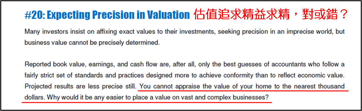 如果公司價值是保持恆定 (remain constant),股價的運行軌跡就如行星繞着太陽般轉動得以預測,投資會是多麼簡單的一回事。我們都明白現實卻非如此,一間公司的真實價值根本無法確定,所以遑論我們是否在以折讓價格買入其股票呢?於是延伸至第二十個思想的探討,就是“估值追求精益求精,對或錯?”卡拉曼表示許多投資者堅持在分析過程中做到一隻股票的精確估值,就是在一個充滿不確定性的世界裏追求精益求精;但我們面對的現實卻是,一間公司是不可能被精確估值的。原因是公佈出來的賬面價值 (book value)、盈利 (earnings) 和現金流 (cash flow),說到底都只是根據一套相對嚴格的標準和原則得出的合理會計估算。