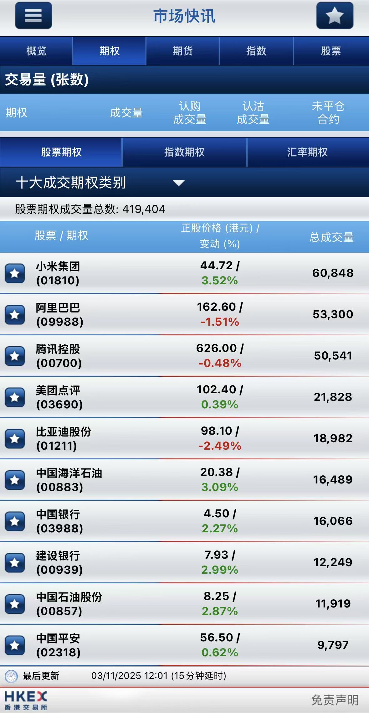 截止午間收盤,港股期權半日成交近42萬張,其中,小米集團-W成交量居首,期權成交突破6萬張;阿里巴巴-W名列次席,期權成交5.33萬張;騰訊控股位居第三,期權成交5.05萬張。