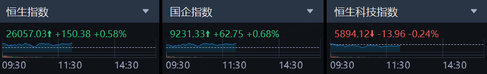 11月3日,港股上午盤三大指數漲跌不一,恒生指數漲0.58%重回26000點,國企指數漲0.68%,恒生科技指數表現較弱,午間收跌0.24%。