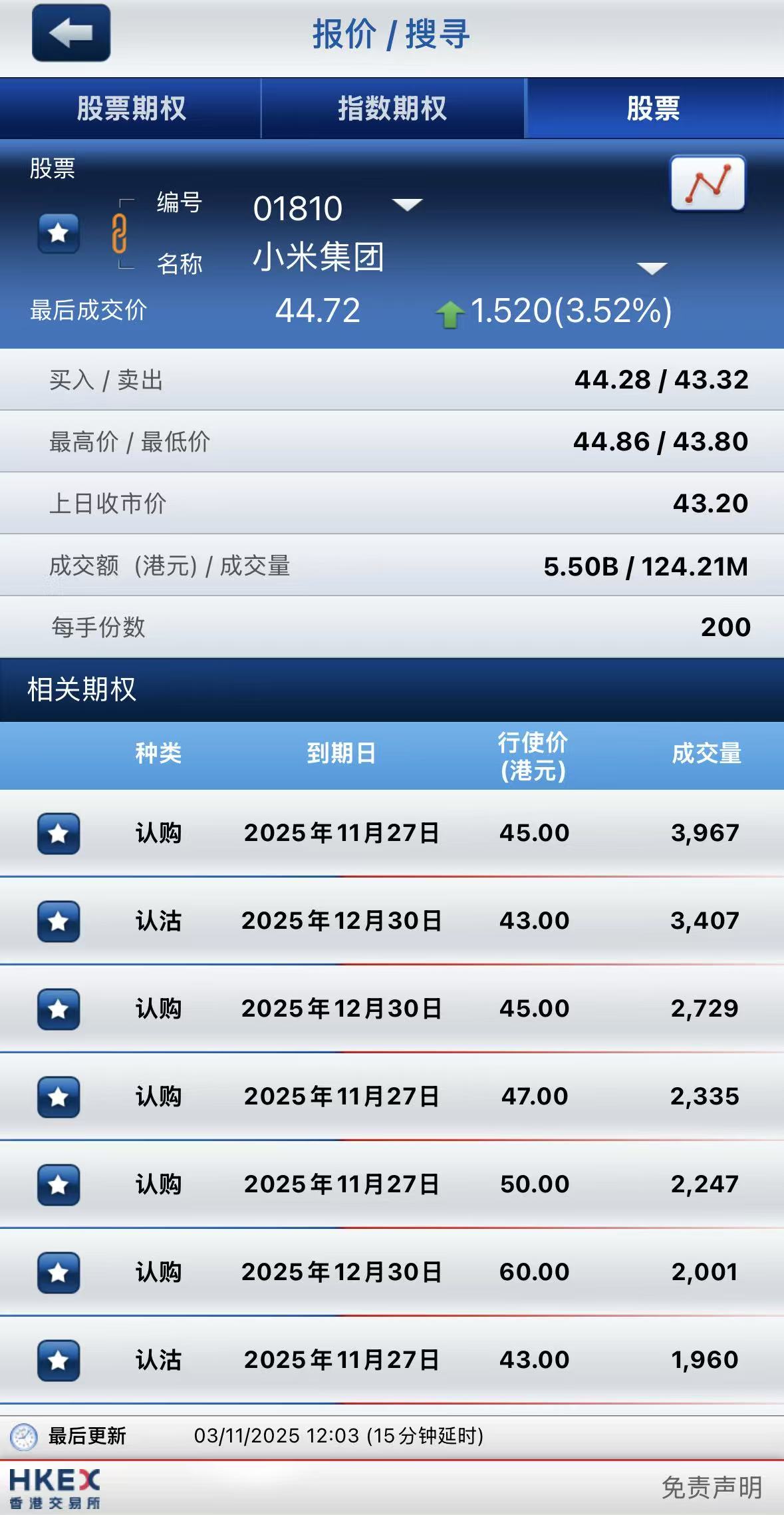 小米集團-W上漲3.5%,成交額超55億港元;期權方面,小米集團期權成交量激增至逾6萬張,其中11月27日到期行使價45港元的認購期權成交居前,成交近4000張。