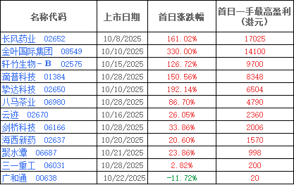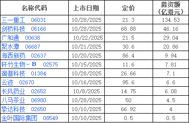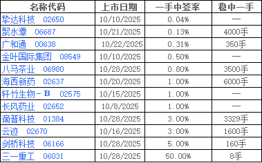 10月港股打新市場迎來“豐收季”,賺錢效應尤爲顯著。當月共有5只新股在首日掛牌時漲幅突破100%,其中此前奪得港股“超購王”的金葉國際集團表現搶眼,首日漲幅高達330%,進一步印證了市場對熱門新股的追捧熱度。不過,並非所有新股都能共享這份熱度,僅廣和通一家在首日破發,而此前以134.53億港元募資額成爲“募資王”的三一重工,首日漲幅不足3%,在同期新股中表現稍顯遜色。