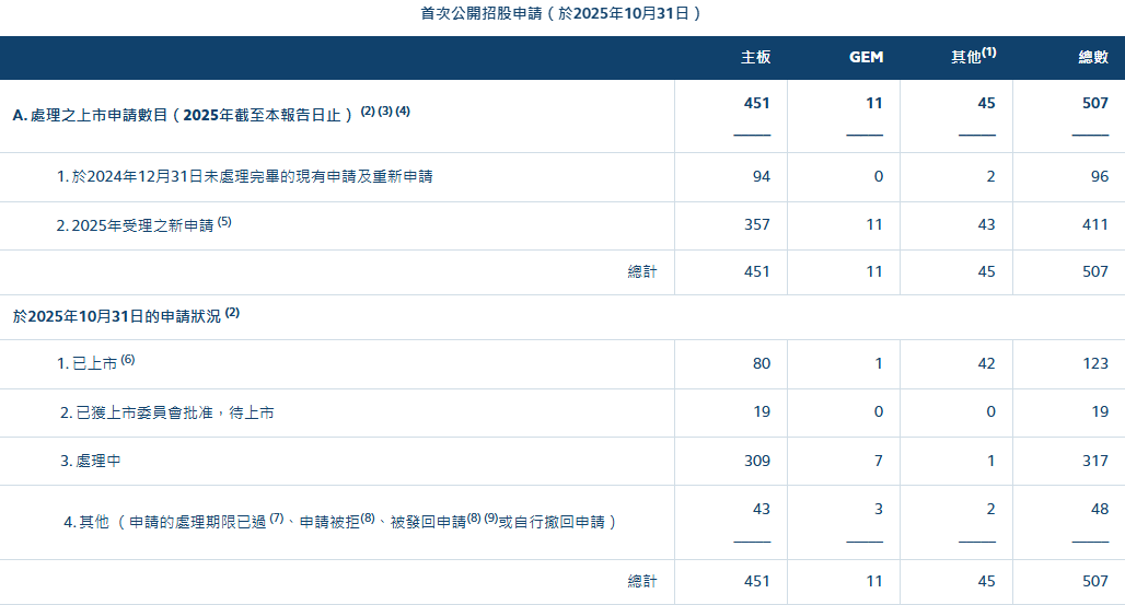 據港交所披露,今年以來受理之新申請數量達到411個,其中357個主板,1個GEM。目前,已獲上市委員會批准,待上市數量爲19家。