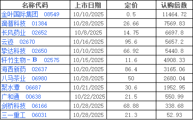 金吾財訊 | 港股“打新”市場的賺錢效應持續升溫。10月新股IPO數量繼續保持高位,認購情緒高漲,金葉國際集團認購倍數超萬倍,同時,多隻新股上市首日表現亮眼,市場交投活躍度顯著提升,爲香港資本市場注入新活力。