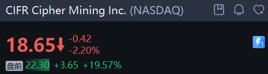 加密礦業 Cipher Mining Inc. 漲超19%,與亞馬遜AWS達成一項價值約55億美元,爲期15年的租賃協議。