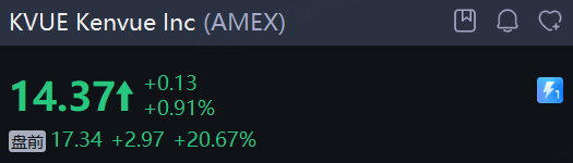 泰諾生產商Kenvue Inc 大漲超20%,報道稱金佰利將以現金加股票交易方式收購kenvue。