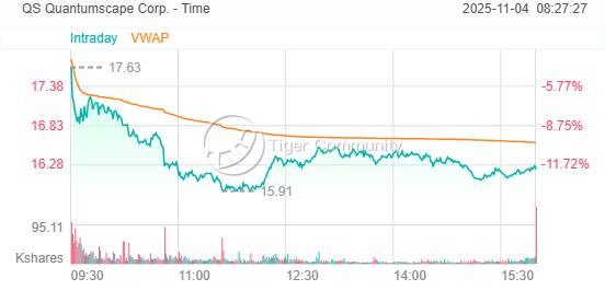 固態電池公司 Quantumscape Corp. 跌12%,據SEC公告,該公司董事Brad W Buss,於2025年10月31日出售了QuantumScape(QS)的30萬股股票,總金額爲5,392,580美元。