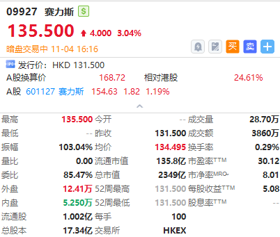 華盛資訊11月4日訊,港股”豪華新能源車企“賽力斯正在暗盤交易中,截至發稿漲3.04%,報135.5港元/股,中籤一手賬面浮盈400港元,最新總市值超2300億港元。該股預計將於11月5日正式掛牌上市,配售結果將於今日晚間披露。
