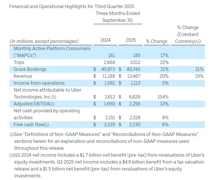 優步 2025年Q3營收134.7億美元,同比增長20%,市場預期132.75億美元,上年同期111.88億美元。