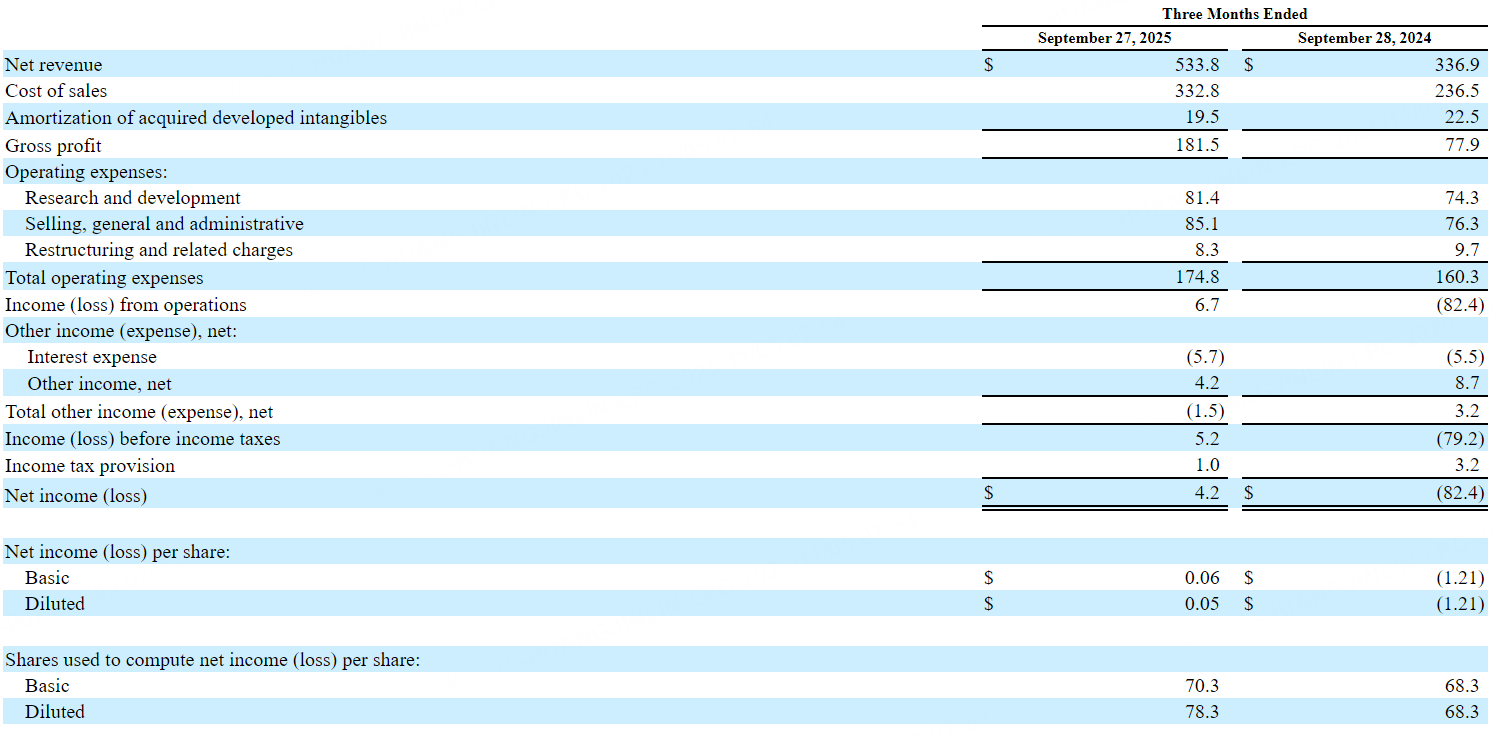 光學技術和激光解決方案上市公司Lumentum 公佈業績,盤後一度大漲14%,目前漲約10%,業績如下: