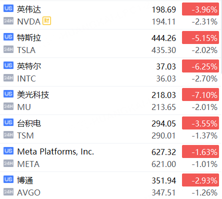 11月5日,美股夜盤時段,明星科技股夜盤普跌,英偉達、特斯拉、英特爾、美光科技跌超2%。