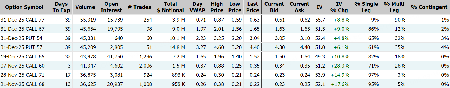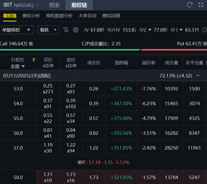 期權方面,iShares Bitcoin Trust ETF當日期權成交逾200萬張,較90日均量放大近3倍,看漲期權佔比大幅回落,其中於12月31日到期的77美元行使價的遠期看漲期權成交居前,成交逾5.5萬張;此外,從期權鏈上看,iShares Bitcoin Trust ETF多張於本週五到期的Put單翻倍大漲。 $IBIT 20251231 77.0 CALL$ $IBIT 20251107 57.0 PUT$
