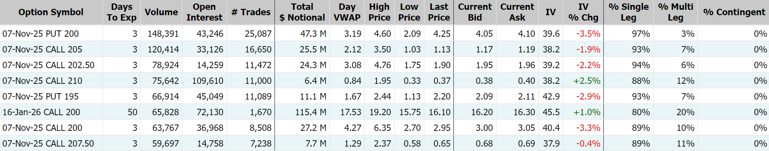 期權方面,英偉達當日期權成交236.5萬張,看漲期權佔比63.7%,其中於11月7日到期的200美元行使價的看跌期權、11月7日到期的205美元行使價的看漲期權成交居前,分別成交14.84萬張、12.04萬張。 $NVDA 20251107 200.0 PUT$ $NVDA 20251107 205.0 CALL$