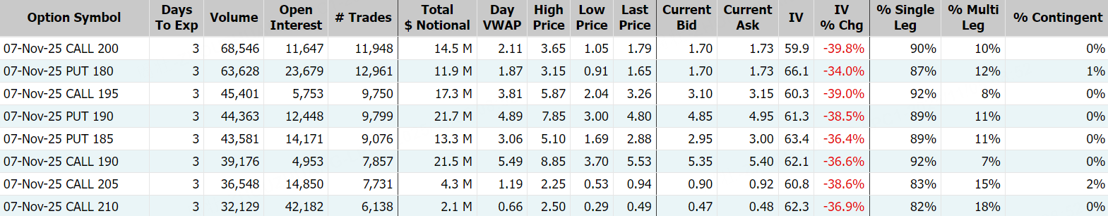 Palantir當日期權成交156.39萬張,看漲期權佔比56.9%,其中於11月7日到期的200美元行使價的看漲期權、11月7日到期的180美元行使價的看跌期權成交居前,分別成交6.86萬張、6.36萬張。$PLTR 20251107 200.0 CALL$ $PLTR 20251107 180.0 PUT$