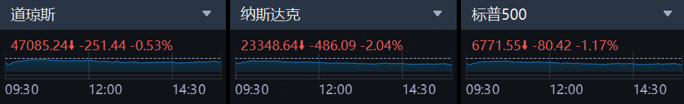 週二,美股三大指數集體收跌,截至收盤,標準普爾500指數跌1.17%,報6771.55點;納斯達克綜合指數跌2.04%,報23348.64點;道瓊斯工業平均指數跌0.53%,報47085.24點。