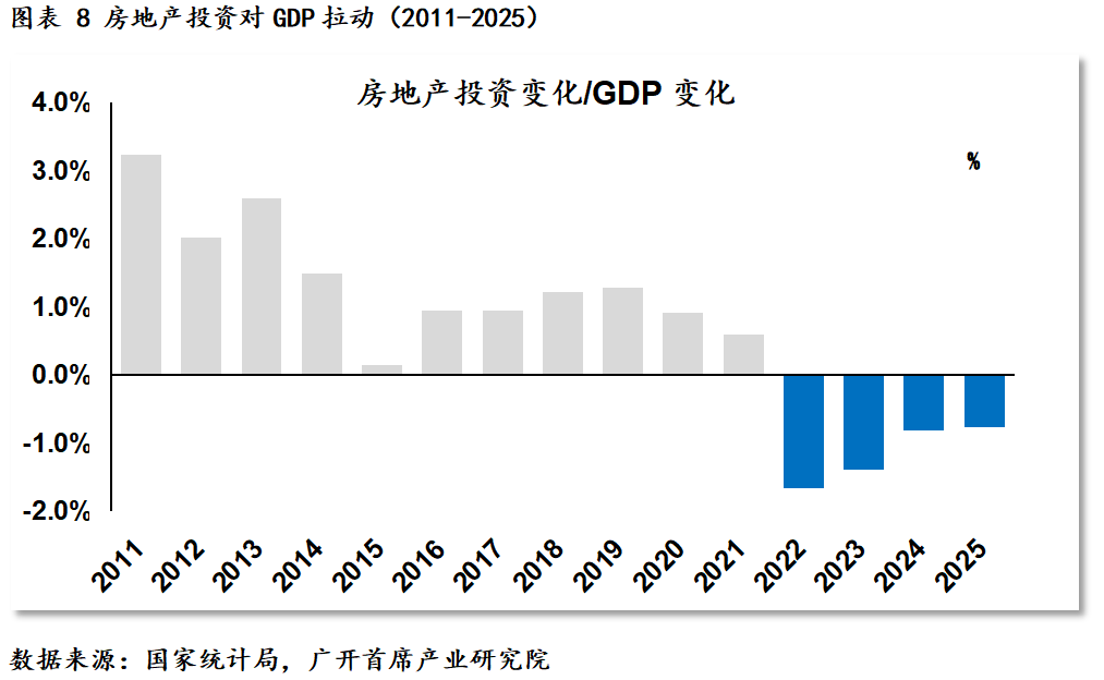 “十五五”時期,國內房地產市場總體仍將處於由築底走向平穩運行的階段,房地產市場本身運行趨穩並不等同於房企市場風險完全可控。“十五五”前半期,房地產市場下行仍然可能是拖累GDP增長的最主要因素。經測算,“十五五”時期,房地產投資平均每年跌幅爲4.5%,假設GDP增速在4.5%左右,預計平均每年房地產投資對GDP的貢獻率下降約6個百分點,拖累GDP增速0.25個百分點左右(見圖8)。儘管拖累程度較“十四五”時期有所減輕,但長期對經濟造成的負面影響不可小覷。在我國居民消費支出結構中,直接與住房相關的支出佔比約四分之一,包括房產購置、日常租金、水電煤能源支出,另外還有與之相關的裝潢建材、家電、傢俱等,而房地產市場的下行意味着居民相關消費支出的減少,進而拖累整體消費增長。從居民收入端來看,由於存量商品房仍有下行壓力,房產作爲普通居民最主要的非金融資產,長期的持續資產減值縮水將進一步影響居民日常的消費支出能力和消費偏好。預計“十五五”時期,房地產投資下行每年可能拖累固定資產投資約0.5個百分點,這對當下不到3%的固定資產投資增速而言,其拖累程度不言而喻。土地出讓收入的減少對地方財力形成制約,進而直接減少地方基建投資。