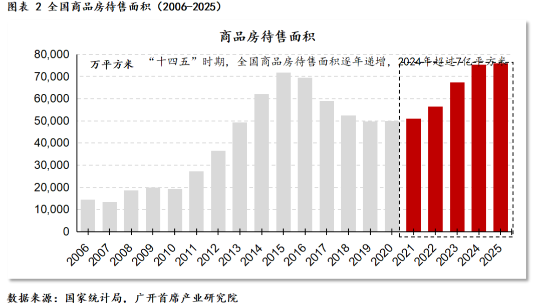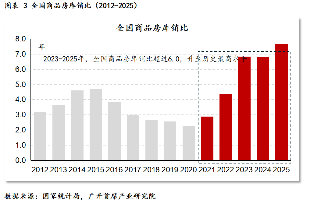 當前我國住房庫存水平處於歷史高位。“十四五”時期,全國商品房年均待售面積爲6.54億平方米,較“十三五”時期5.61億平方米多增16.5%;同期,全國商品房庫銷比均值水平位5.5,較“十三五”時期2.9的水平多增92%,商品房庫存積壓程度爲歷史之最。“十四五”尾部時期庫存水平則更高。截至2025年6月,全國商品房待售面積爲7.6億平方米(見圖2),較2020年末淨增2.6億平方米,累計增加52%;商品房庫銷比爲7.7(見圖3),較2020年末2.3的庫銷比水平淨增5.4,大約多增2.5倍。商品房庫銷比和存量待售面積兩項指標均處於歷史最高水平區間,表明全國範圍內,商品房供應過剩狀況較爲嚴重,需要一個較長時期才能得到消化。