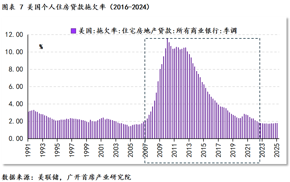 在房價持續存在較大下行壓力之下,個人按揭貸款有較大範圍違約的潛在風險。參考全球主要房地產市場的歷史運行規律,個人住房貸款不良/拖欠率通常具有典型的尾部風險特徵。即隨着房價的持續下跌,個人存量住房貸款不良率將逐漸上升,尤其是在房價下跌的尾部階段,個人住房貸款的不良率可能以指數化方式陡然升高。以美國爲例,在次貸危機時期,個人住房貸款拖欠率從2007年前2%左右的平均水平大幅攀升,2009~2012年拖欠率在10%以上(見圖7);直到2022年6月,該指標纔回到2%以內。香港在1998年爆發金融危機後,按揭貸款拖欠比率快速飆升至原有水平的十倍以上。類似的情況在上世紀九十年代日韓都發生過。尤其當存量房價距離歷史高點持續累計跌幅接近或者超過50%以上後,個人住房違約風險可能集中爆發。儘管我國購房首付比例較高,相對發達國家有較高的安全墊,如果未來一個階段我國商品房價格持續下跌30%甚至更高,居民部門住房貸款違約風險仍可能大幅上升。而居民部門住房貸款從爆發危機到迴歸安全水平可能需要消耗10~15年的時間,對市場的健康運行帶來很大的負面壓力。