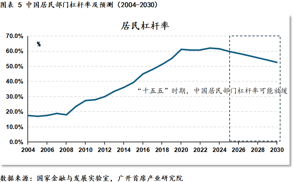 居民部門槓桿率達峯值後逐步走低。由於住房需求釋放節奏進一步放緩,新增個人按揭貸款仍然可能負增長。假設未來一個時期,中國GDP增速保持在4.5%左右,住戶貸款增速保持在2%左右的增速,居民個人住房貸款增速按照(2022~2025年,剔除疫情影響)平均-0.6%的增速計算,預計到“十五五”末期,個人住房貸款佔居民貸款的比例將從“十四五”末期的45%降至40%,居民部門槓桿率將從61%左右的水平降至54%(見圖5)。居民部門槓桿率下降與全球發達經濟體房地產運行週期的規律相吻合。由於居民部門存量債務處於相對偏高的水平,居民部門爲了減輕償債壓力,減少房產購置和進行存量債務提前償還是主要的選擇方式;而居民信貸增速低於GDP增速,居民部門槓桿率將自然回落。長期來看,居民部門槓桿率的回落將有助於提升居民部門潛在的購房能力。