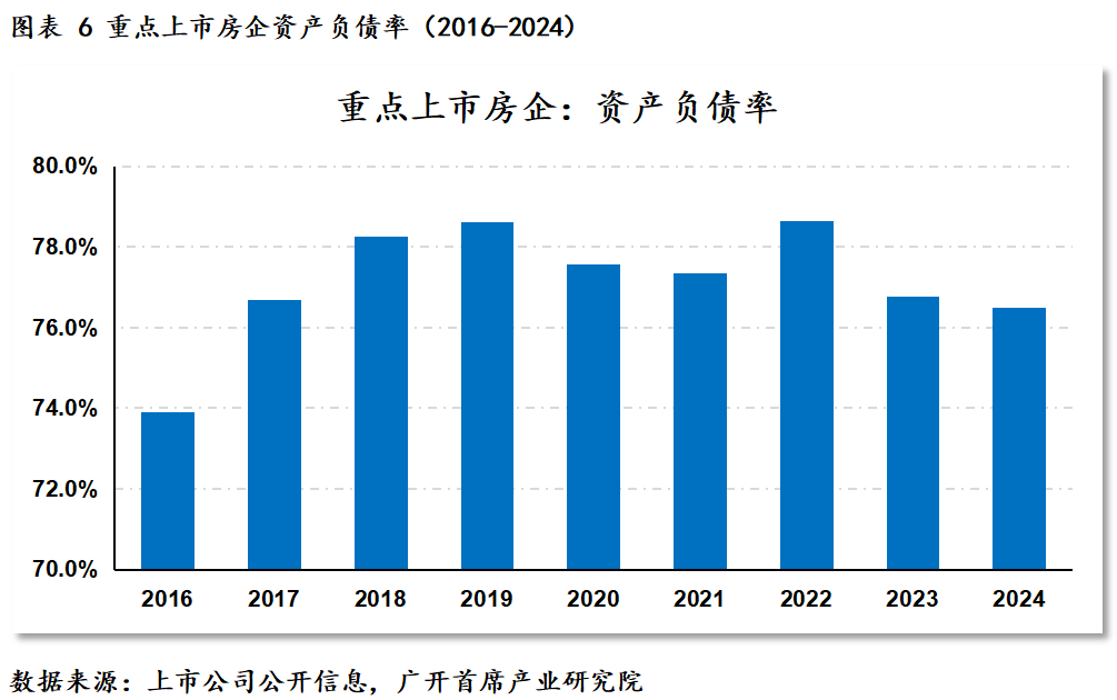 房企存量債務“尾部風險”壓力猶存。商業銀行未來持續增加對房企信貸支持依然存在難度。房地產銷售的持續下滑對房企營收仍有負面影響,進而可能導致部分開發商資信評價的調降。長期持續高負債率增加房企還本付息壓力。儘管住房金融政策對維持部分房企流動性給予了必要的支持,但當前主要的上市房企資產負債率仍然在75%~80%的高負債壓力水平之上(見圖6),每年仍將至少有15%~20%的資金用於還本付息,由此帶來的房企現金流壓力仍然偏緊。除非針對房企出臺大規模債務出清的專項政策,否則在房地產中長期下行週期中,即便是經營比較穩健的公司也可能會因爲暫時性的資金週轉問題而被迫出現債務違約或付息困難的情況。
