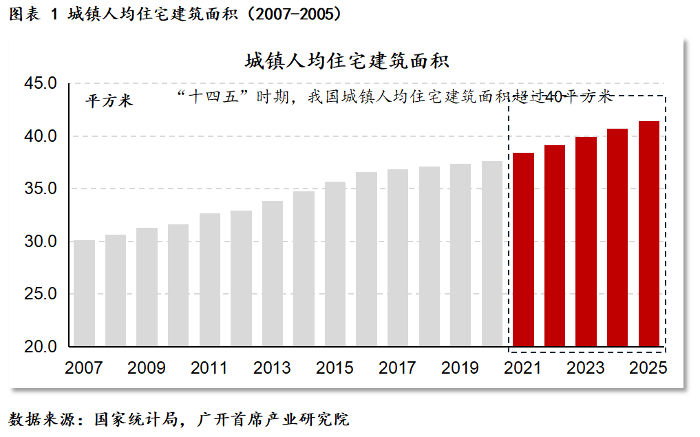 從全球來看,我國居民目前住宅水平已達中等偏高水平。2023年底,我國城鎮人均住房建築面積已超過40平方米。參考2021~2023年均值變化測算,預計到2025年底,我國城鎮人均住房建築面積可能達到41.4平方米(見圖1),較“十三五”時期累計增長約3.8平方米,表明我國城鎮人均住房建築面積將持續上升。城鎮戶均套戶數從2004年的0.84套,至2020年的1.02套,到2025年套戶數接近1.10套。目前美日約爲1.15~1.20,英德爲1.0~1.05水平。