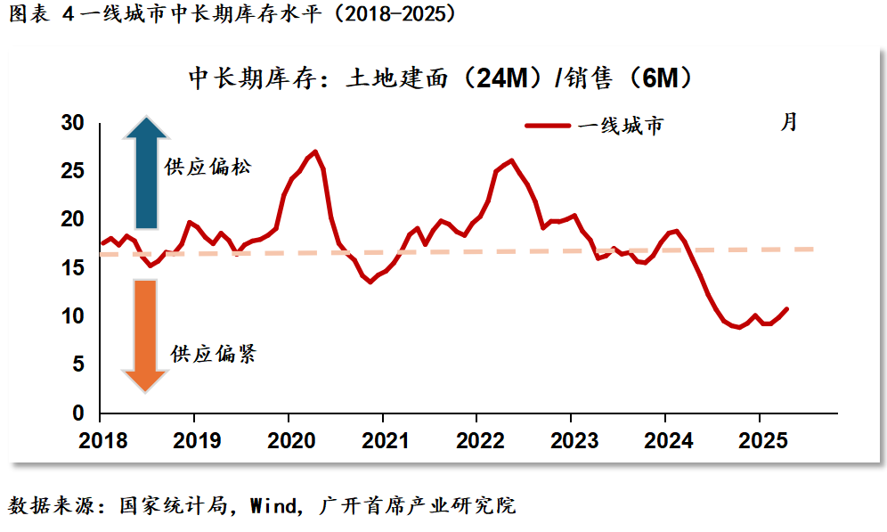 五是土地市場總體仍然較爲疲軟。按照經濟高質量發展的要求,“十五五”時期我國土地市場將延續集約化道路,意味着可供拍賣的住宅用地規劃建設面積仍然可能會持續減少,尤其是低能級城市土地供給方面仍將價低量減。鑑於低能級城市庫存高、住房需求弱,其土地供求比在“十四五”末期已經大幅回落,從2020年末的1.27降至1.16,預計“十五五”時期低能級土地市場供求比可能降至1.10左右,土地成交金額累計下降約三成。而一線及部分高能級城市土地市場有望在“十五五”時期走穩復甦,因長期庫銷比( 長期庫銷比=連續2年土地建築面積/連續6個月商品房銷售面積)處於供給不足的水平(見圖4)。截至2025年上半年,一線城市商品房長期庫存約11個月,遠低於18個月的均衡水平。預計到“十五五”末期,一線城市每年土地成交金額爲450億元,較“十四五”末期增長2.8%,同期一線城市土地成交佔比也將從18.5%升至接近25%。綜合測算,“十五五”時期年均土地購置費約達3.2萬億元,較“十四五”時期累計下降16.5%。