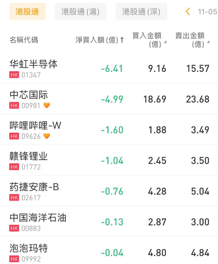 華虹半導體、中芯國際、嗶哩嗶哩-W分別遭淨賣出6.41億港元、4.99億港元、1.6億港元。