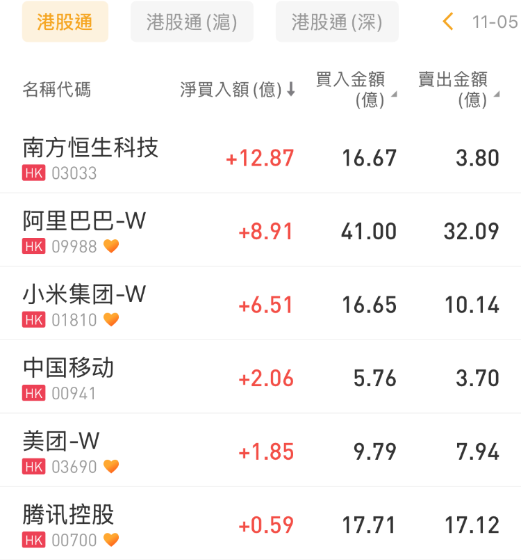 南方恒生科技、阿里巴巴-W、小米集團-W分別獲淨買入12.87億港元、8.91億港元、6.51億港元;