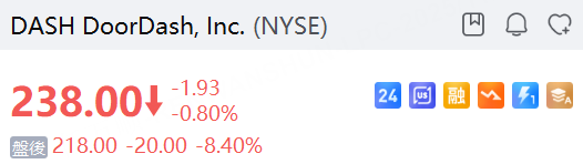外賣平臺Doordash(DASH) 第三季淨利潤按年增約51%至2.4億美元,每股盈利爲55美仙,低於預期的69美仙。營收按年增長27%至34.5億美元,高於市場預期的33.6億美元。該公司公佈業績後,盤後股價一度急挫20%,現在收窄至跌8%。