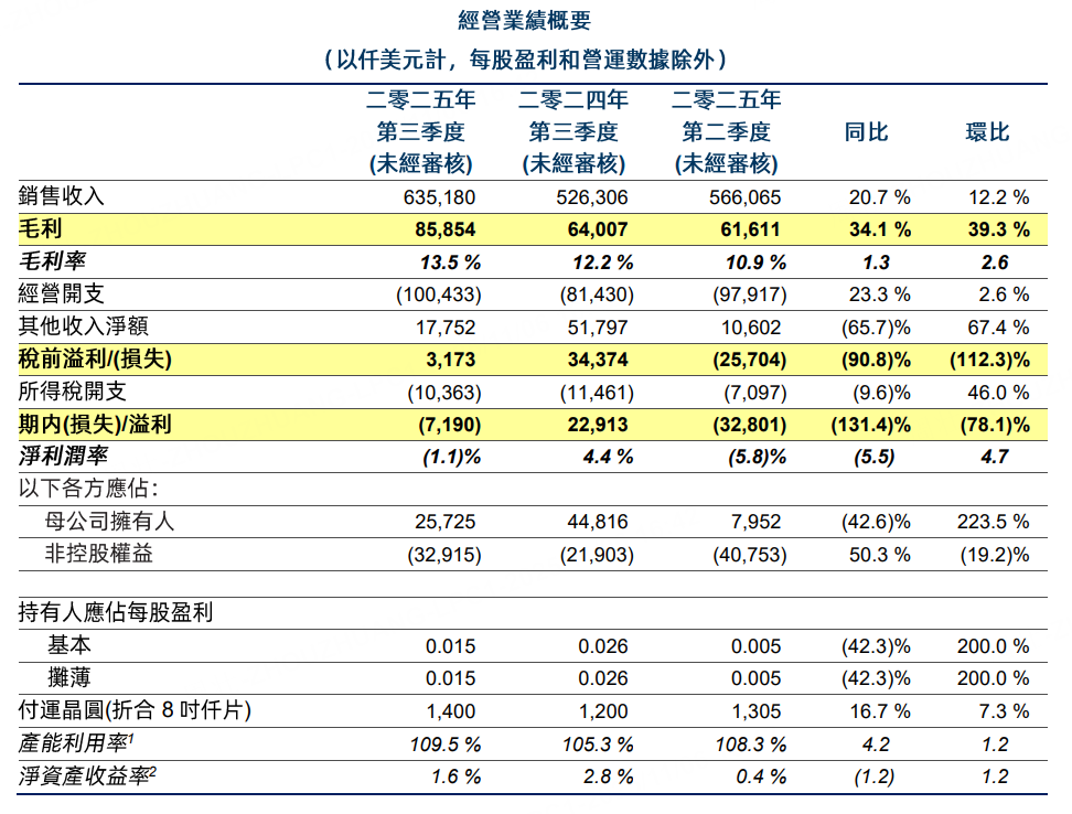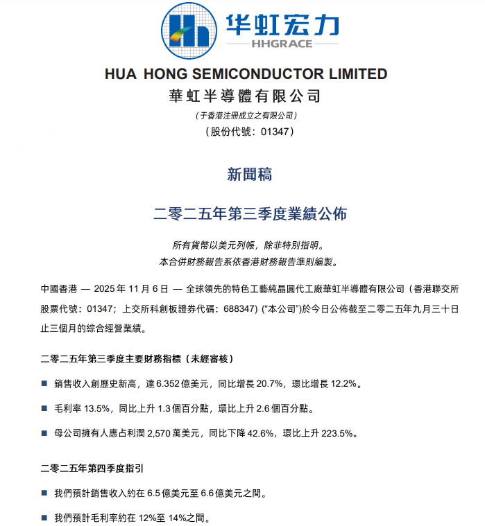 11月6日,華虹半導體港股公告,第三季度銷售收入創歷史新高,達6.352億美元,同比增長20.7%,環比增長12.2%;母公司擁有人應占利潤2570萬美元,同比下降42.6%,環比上升223.5%。預計第四季度銷售收入約在6.5億美元至6.6億美元之間;預計毛利率約在12%至14%之間。