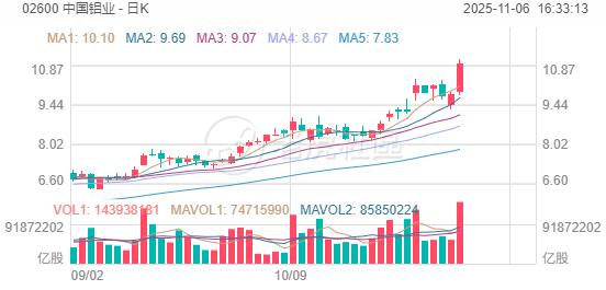 有色金屬板塊集體上漲,中國鋁業漲超11%,中國宏橋漲近10%,贛鋒鋰業漲超6%,洛陽鉬業、中鋁國際漲近6%,天齊鋰業漲超5%;