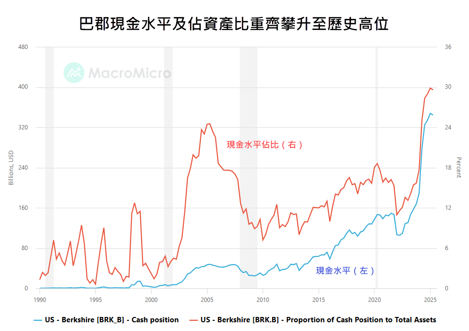 自2022年第三季起,巴郡已連續三年錄得淨沽出股票的情況,累計金額達184億美元;與此同時,現金水平亦節節上升,最新已突破3,400億美元,佔總資產比例約三成,雙雙創下歷史新高(見圖1)。