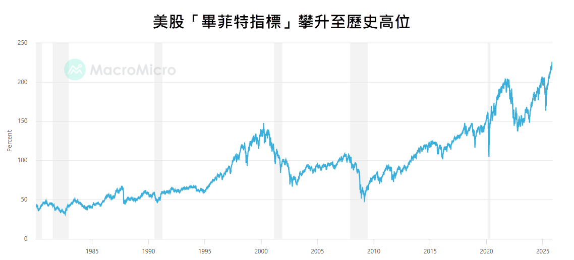 這種審慎部署,或多或少反映出畢菲特對當前市場估值過高的憂慮。他一向推崇的市場估值指標 ---“股市總市值佔GDP比率”(俗稱的“畢菲特指標”),今年中已升穿2倍水平,並突破2021年底及2024年底的高位,最近更攀升至約222%的歷史新高,顯示美股估值已處於極度昂貴的區間(見圖2)。