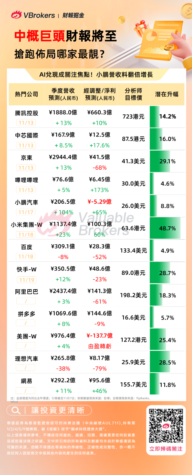 小米集團-W方面,雖然股價近期遭遇短期逆風,但得益於Q3智能手機恢復正增長且電動車交付量持續提升,業績依舊保持高增長;預計Q3總收入及經調整淨利潤將實現同比分別增長22%及60%,達1137億及100億元。投資者重點關注小米第二座電動車工廠獲批投產,將成爲推升股價重估的催化劑。