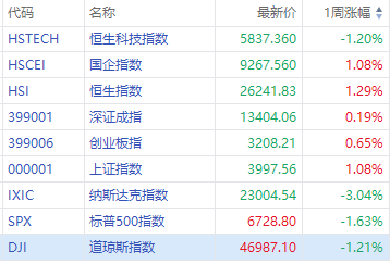 港股方面,本週恒生指數漲1.29%,報26241.83點;恒生科技指數跌1.2%,報5837.36點;國企指數漲1.08%,報9267.56點;