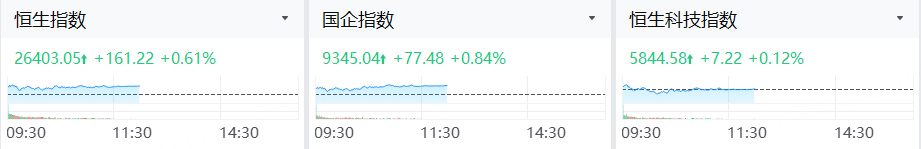 11月10日,港股三大股指齊漲,截止午間收盤,恒指漲0.61%,科指漲0.12%,國企指數漲0.84%。
