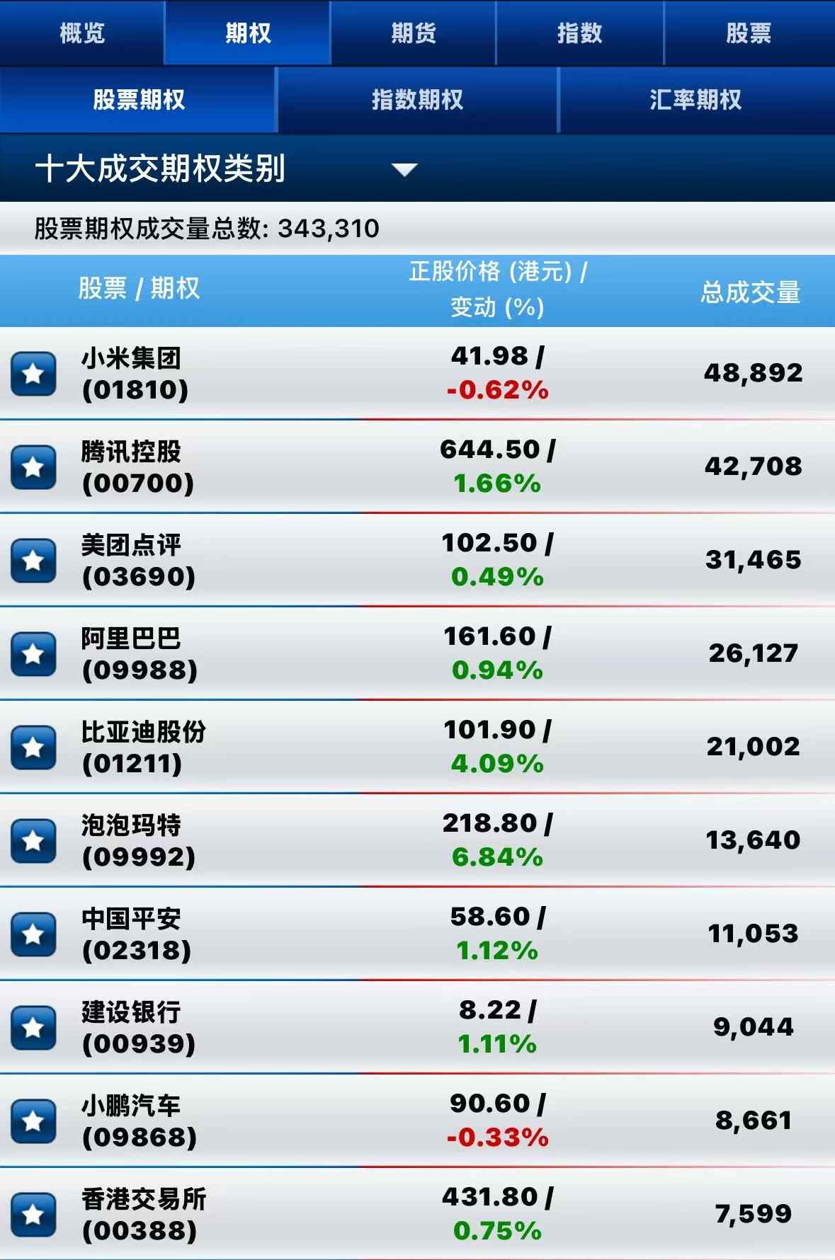截止午間收盤,港股期權半日成交超34萬張。其中,小米集團-W成交量居前,期權成交近4.9萬張;騰訊控股名列次席,期權成交近4.3萬張;美團-W位居第三,期權成交超3.1萬張。