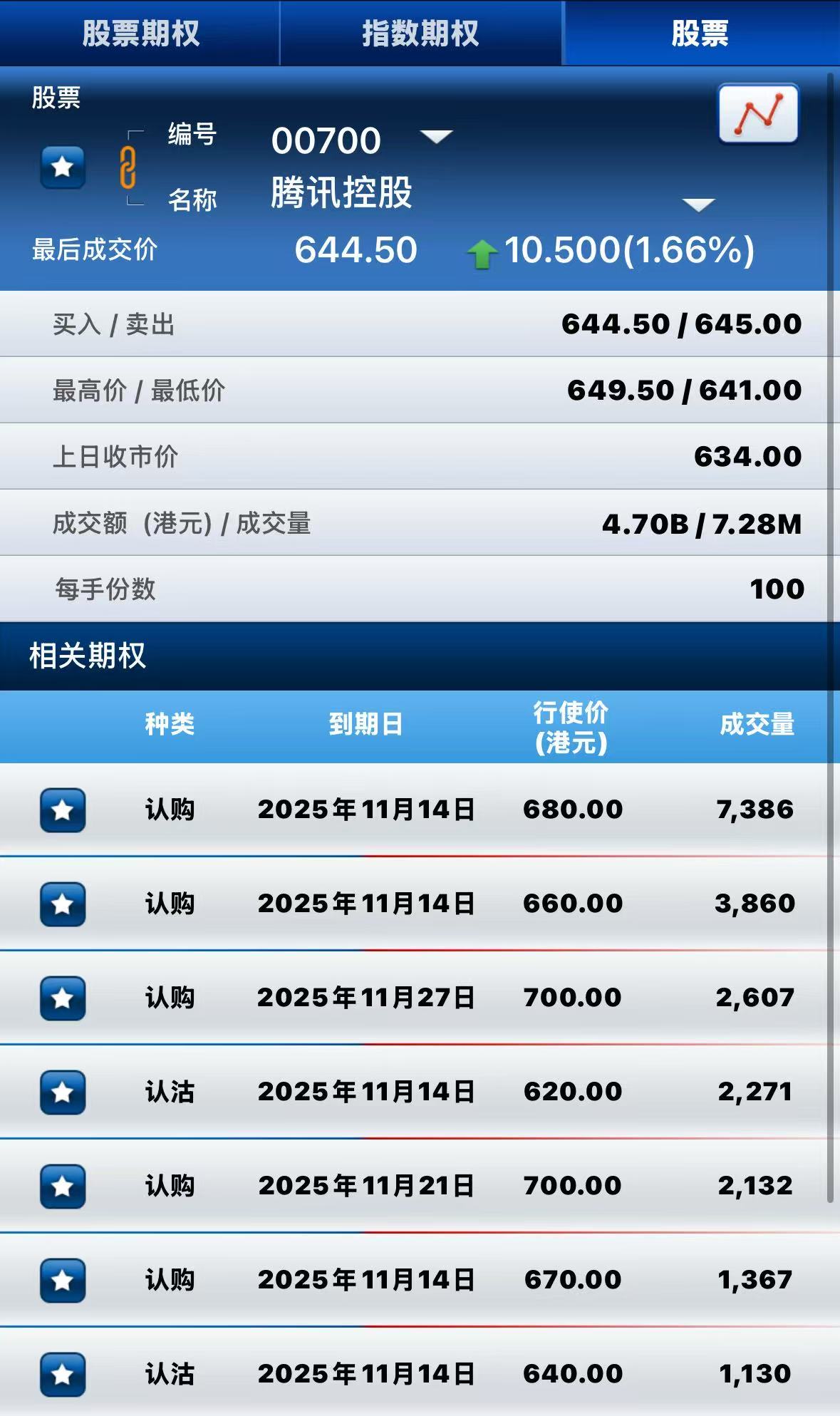 騰訊控股上漲1.66%,期權方面:半日成交近4.3萬張合約,其中於2025年11月14日到期行權價680港元的認購期權成交量居前,成交超7300張合約。 $TCH.HK 20251114 680.00 CALL$