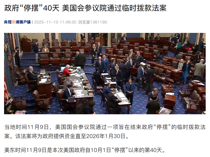 當地時間11月9日,美國國會參議院通過一項旨在結束政府“停擺”的臨時撥款法案。該法案將爲政府提供資金直至2026年1月30日。