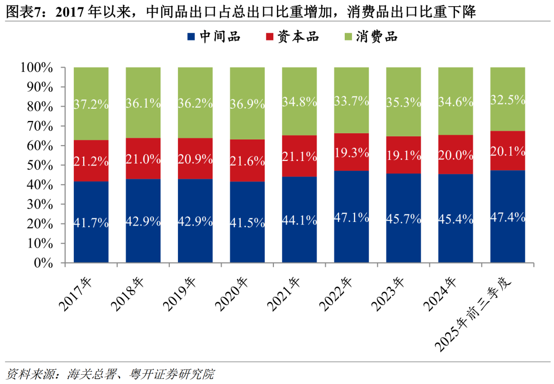 出口的商品結構顯著升級。2017—2024年,中間品出口佔總出口比重從41.7%升至45.4%,提高3.7個百分點;資本品出口佔比從21.2%降至20%,回落1.2個百分點;消費品出口佔比從37.2%降至34.6%,回落2.6個百分點。2025年前三季度,中間品出口佔比進一步提升至47.4%,消費品佔比降至32.5%。