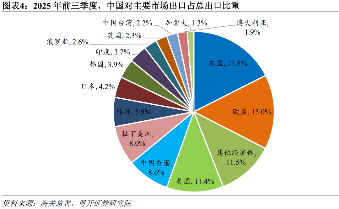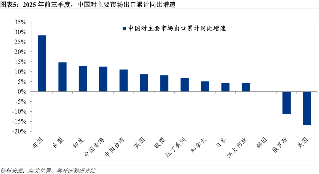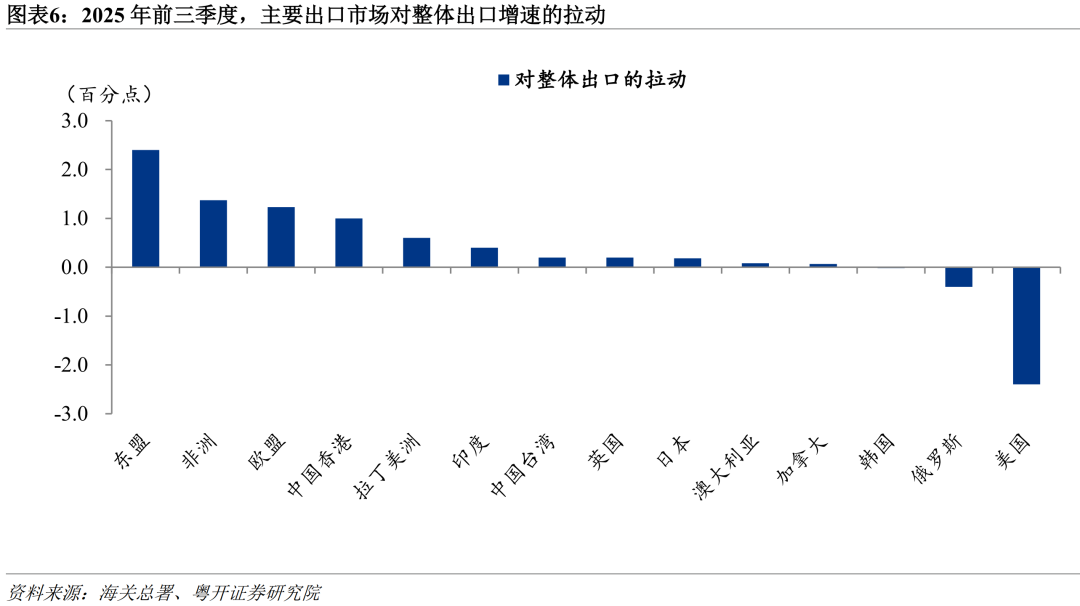 2025年前三季度,在主要出口市場中,中國僅對美國、俄羅斯、韓國的出口同比錄得負增長。其中,對美出口受貿易摩擦衝擊,同比下降16.9%,拖累整體出口2.4個百分點;對俄出口同比下降11.3%,主要受俄國內經濟疲軟及去年同期高基數影響;對韓出口同比下降0.3%,與韓國自身經濟動力不足有關。與此同時,對非洲、東盟、印度、英國、歐盟、拉美和加拿大等主要市場出口同比均實現顯著增長,增速分別爲28.3%、14.7%、12.9%、8.7%、8.2%、6.9%和5.1%,合計拉動總體出口增長約6.3個百分點。