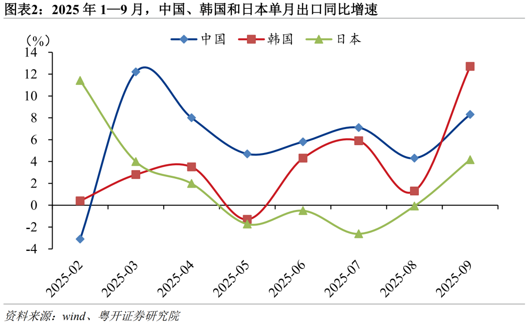 中國出口份額或將進一步增長。中國出口增速雖低於越南,但顯著高於韓國、日本等其他主要出口型經濟體。2025年前三季度,韓國和日本出口同比分別增長2.3%和2.5%,明顯低於中國;越南雖以16%的高增速領先,但由於出口基數較小,對全球貿易總量影響有限。綜合來看,預計2025年中國出口佔全球出口份額將繼續提升,繼續鞏固其在全球出口競爭格局中的相對優勢。