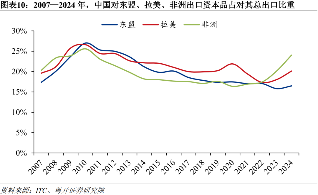 “出海”企業依賴從中國進口關鍵零部件和核心原材料,帶動中間品和資本品出口增長。部分中低端產業因成本上升及貿易摩擦等因素向成本更低的經濟體轉移。同時,爲開拓海外市場,中國企業選擇在當地投資建廠。然而,由於中國在關鍵零部件、機械設備及原材料領域具備技術與規模優勢,即使低端環節轉移,海外企業仍高度依賴中國的產業鏈上游,從而帶動中間品和資本品出口增長。2017—2024年,中國對東盟和拉美出口中間品年均增速分別高達11.6%和11.8%,佔對其出口的比重分別提升至54.6%和45.9%。其中,東盟憑藉與中國產業鏈的高度互補,成爲製造環節外溢的主要承接地。2024年,中國對東盟中間品出口佔對全球比重接近20%,居全球首位。
