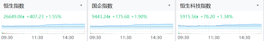 港股三大指數齊漲,恒生指數漲1.55%,恒生科技指數漲1.34%,國企指數漲1.90%。