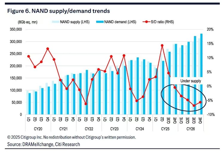 對此,花旗研究團隊在市場預測模型中指出,NAND閃存市場真正供需矛盾會在25Q3(也就是當前節點)徹底爆發,並預計這一矛盾將貫穿2026年全年,甚至持續加劇。在此基礎上,花旗認爲持續的供應短缺將成爲支撐存儲芯片價格最堅實的基石,並認爲NAND閃存合約價將在未來進入一段長期、穩定的上升通道。