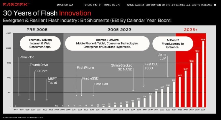 另外,在近期廣爲流傳的Sandisk投資者交流日流出的PPT中,公司管理層在勾勒NAND閃存行業過去30年的發展軌跡之外,對未來的行業增長也顯露出相當自信。Sandisk明確指出,2025年之後儲存芯片將迎來“AI數據時代”。