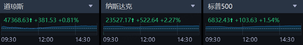 美東時間週一,三大指數集體收漲,美國參議院就結束政府停擺邁出關鍵一步,市場風險偏好回升,英偉達、Palantir等重量級人工智能概念股領漲。截至收盤,道指漲381.53點,漲幅爲0.81%,報47368.63點;納指漲522.64點,漲幅爲2.27%,報23527.17點;標普500指數漲103.63點,漲幅爲1.54%,報6832.43點。