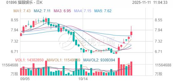 11月11日,港股影視股繼續上漲行情,貓眼娛樂盤初一度衝高近8%,並且錄得7連漲。